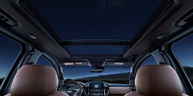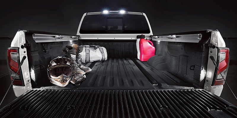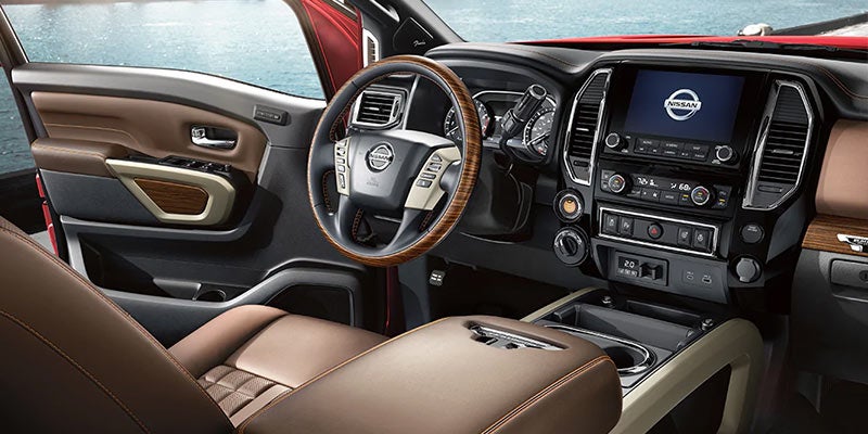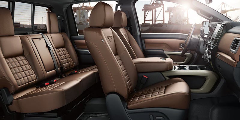 Inside the new Nissan Titan, enjoy a standard push-button start and the Nissan Connect infotainment system with an 8-inch touch screen. Other available interior perks include heated front and rear seats, leather upholstery, dual-zone automatic climate control, ambient lighting, power-adjustable seating with memory functions, and wood, metallic, or chrome accents. Seat five or six inside the Titan, depending on the types of seats you choose, but you'll enjoy more than 20 cubic-feet of increased passenger volume when you opt for the Crew Cab.