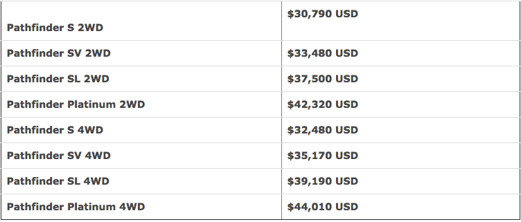 Manufacturer’s Suggested Retail Prices (MSRP)1 for the 2018 Nissan Pathfinder: