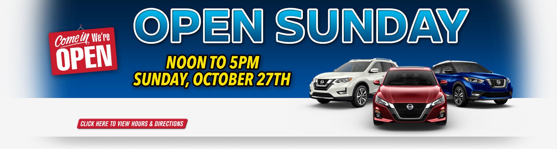Passport Nissan VA will be open Sunday, October 27th from 12PM- 5PM.