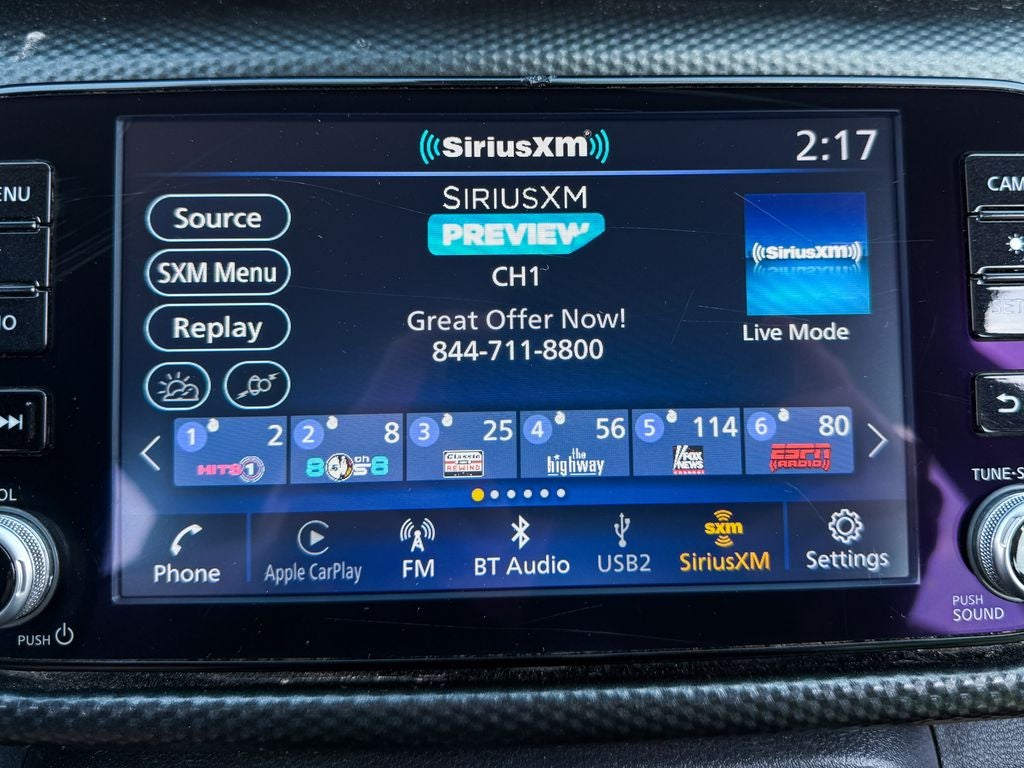 - Radio: AM/FM Audio System -inc: 8" color touchscreen display w/6 speakers, Bluetooth® hands-free phone system, streaming audio via Bluetooth®, Siri eyes free, audio and Bluetooth® steering wheel switches, 3 USB ports (1x front charge and data and 2x rear charge only), type C USB (data and charge) (front), NissanConnect featuring Apple CarPlay, Android Auto, SiriusXM satellite radio w/advanced audio features and hands-free text messaging assistant