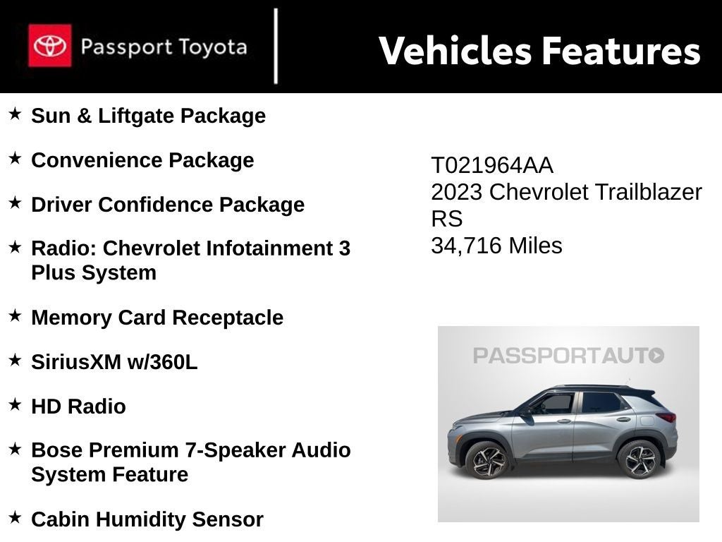 Whether you're embarking on a road trip, navigating the city, or tackling your next adventure, this 2023 Chevrolet TrailBlazer RS is the perfect companion. Its spacious interior, versatile cargo area, and impressive performance make it a standout in its class. Experience the difference for yourself and schedule a test drive today. We're confident you'll be impressed by this exceptional SUV.