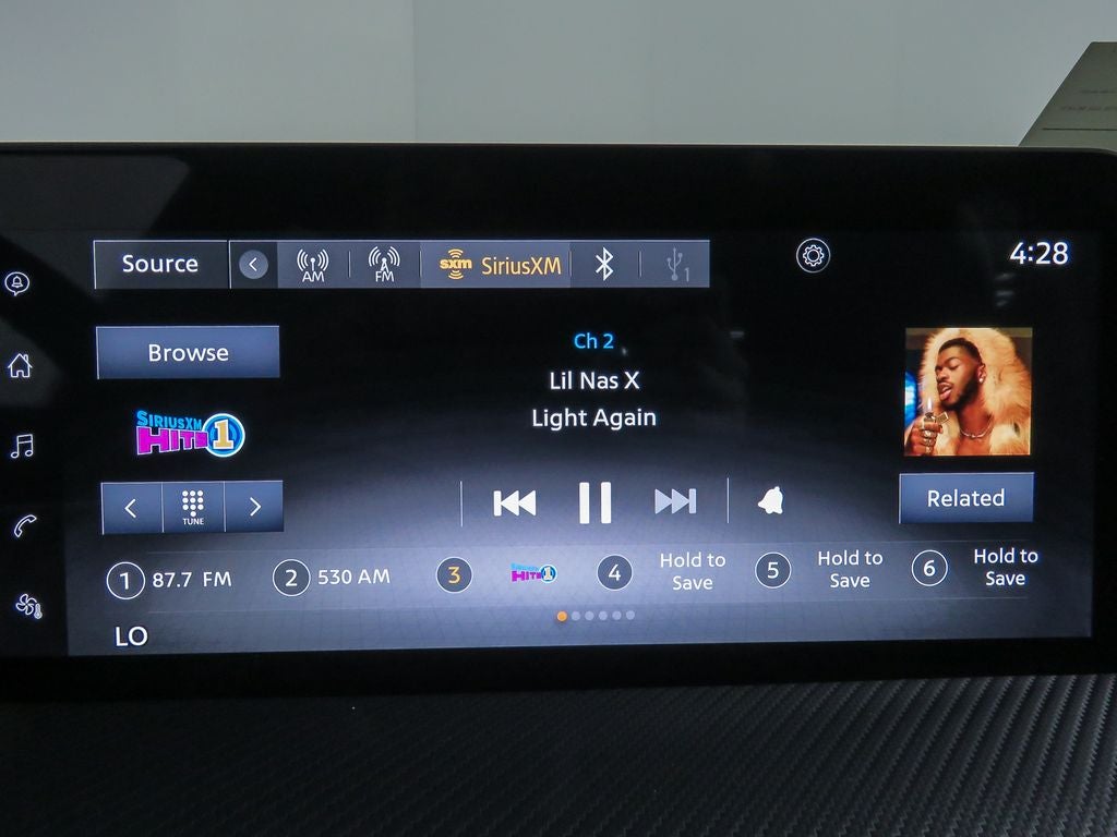 - Radio: AM/FM Audio System -inc: 12.3 color touchscreen display w/6 speakers, Bluetooth® hands-free phone system, streaming audio via Bluetooth®, audio and Bluetooth® steering wheel switches, USB C (data and charge) (front), rear USB type C port (2), NissanConnect featuring wireless Apple CarPlay, wireless Android Auto, Siri eyes free, SiriusXM satellite radio w/advanced auto features and hands-free text messaging assistant